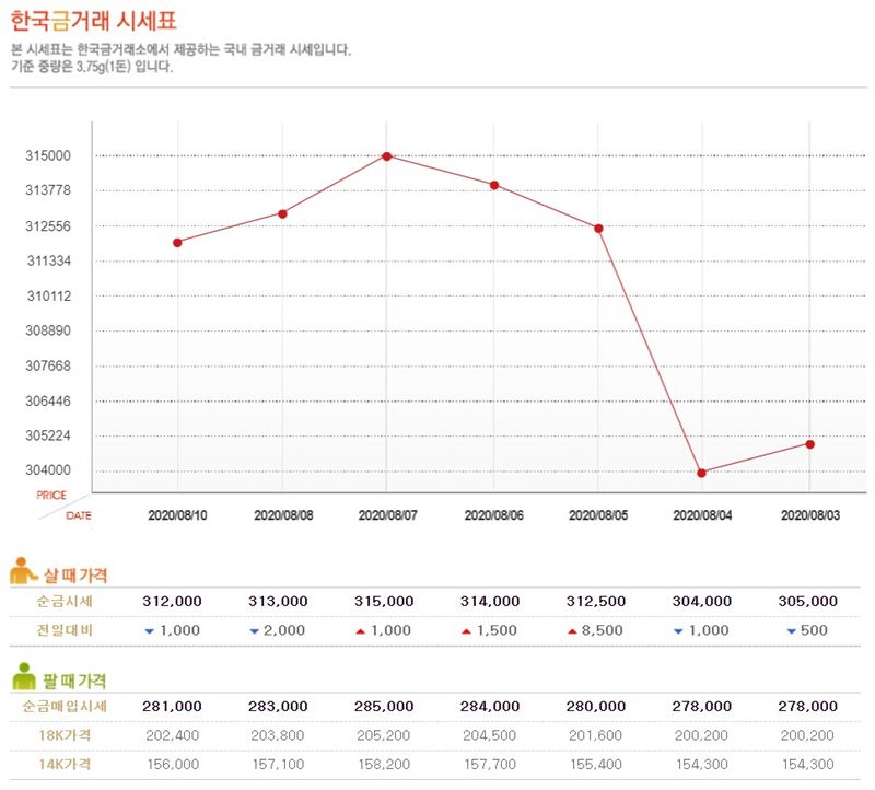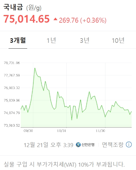 국제 금 선물시장의 금 거래량은 전날 잠시 하락했으나 금 거래가격은 전일 금 거래량에 이어 상승세를 이어갔다. 한국금거래소에 따르면 17일 0시 순금 시세는 매수 시 34만7000원, 매도 시 29만5000원이다. 금 가격은 6주 최고치를 기록한 후 상승세를 보이고 있습니다.