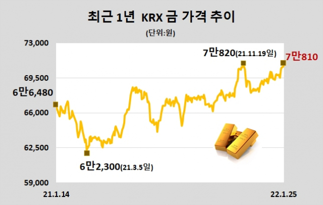 금융권에 따르면 16일 한국금거래소에서 금 1돈(3.75g) 시세는 34만7000원으로 하루 만에 6000원 올랐다. . 신한은행 금고 시세에 따르면 24k 순금 1g 가격은 8만원을 넘어섰다. 순금 1파운드 가격은 부가세 포함 35만1000원을 넘어섰다. 최근 1년 중 최고가에 근접한 가격이다.