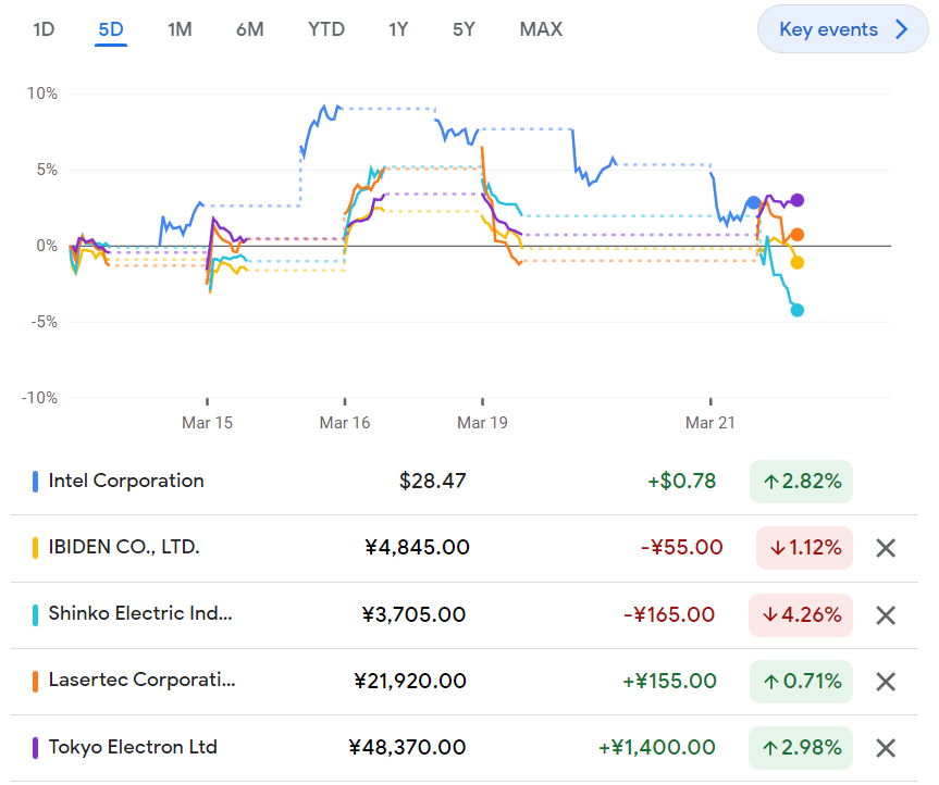 인텔의 주가와 인텔의 공급망에 있는 기업들의 주가와 이들 기업에 대한 개요를 살펴보겠습니다.