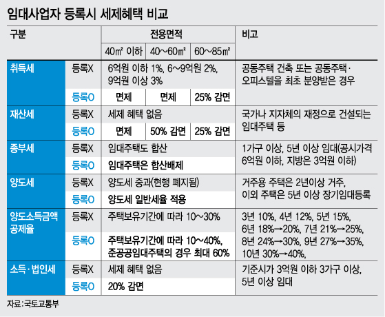 다만 주택임대사업자에 대한 유의사항도 있습니다. 의무기간이 10년 이상이어서 계속 월세를 내야 하고 개인적인 이유로 말소를 신청할 수 없다는 게 단점입니다. 그리고 직전 보증금 대비 증액이 5%로 제한되는 규정이 적용돼 임의로 보증금을 상향 조정할 수 없는 부분도 있습니다. 세제혜택은 최초 분양 시 취득세 감면, 소득세 2천만원 이하 분리과세와 재산세 감면 그리고 장기보유특별공제 등이 있습니다. 그러나 시기와 기준시가, 면적, 의무기간 등 다양한 조건에 따라 다르므로 반드시 세무서나 국세청, 대상지역 시군구청 세무사를 통해 확인하시기 바랍니다.